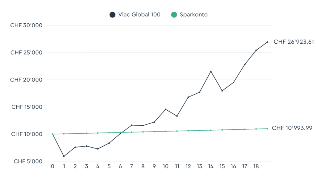 Im Jahr 2008 wird dein Kind geboren und du überweist einmalig CHF 10’000 auf ein Sparkonto und einmalig CHF 10’000 auf ein VIAC Invest Kinderportfolio mit der Strategie Global 100. Beim Sparkonto gehen wir von einem jährlichen Zins von 0.5% aus, während wir für das Kinderportfolio historische Kursdaten verwenden.*