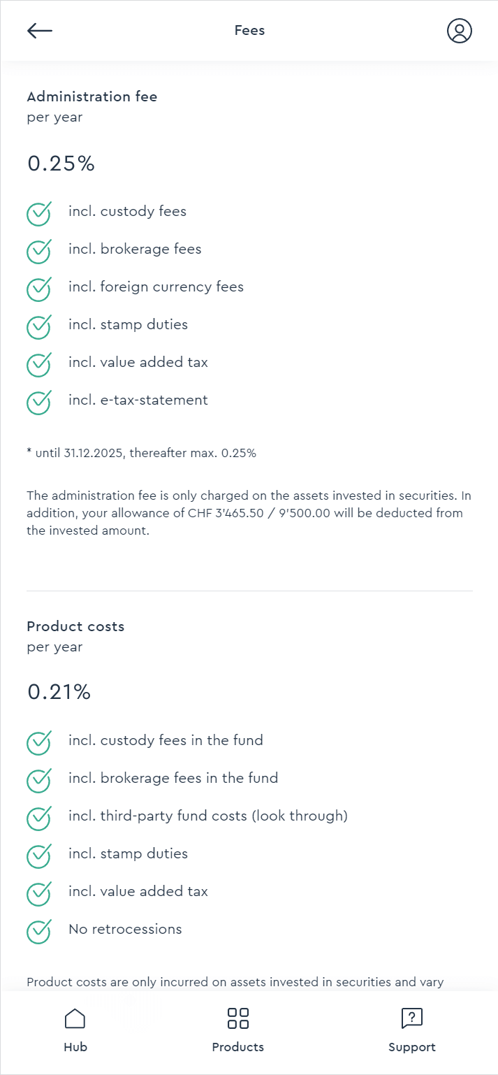 With VIAC Invest, you pay administration fees as well as product fees. Together, these make up the total costs.