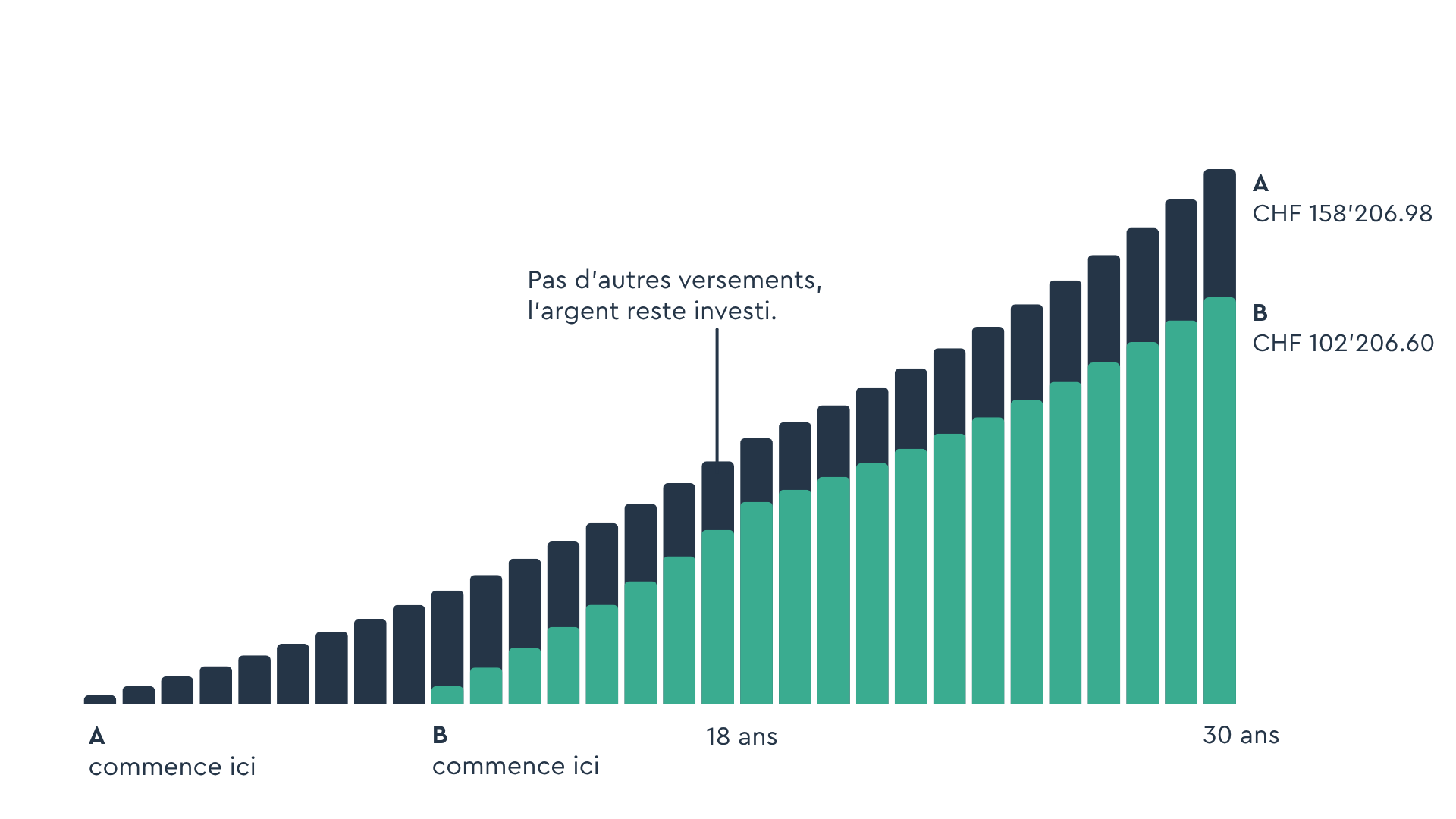 Si les enfants laissaient ensuite cet argent jusque à leur 30e anniversaire (et n’effectuaient aucun autre versement), l’enfant de la personne A disposerait de CHF 158’206.89 et celui de la personne B de CHF 102’942.60 sur son portefeuille.