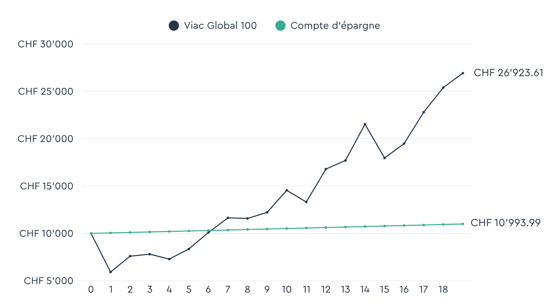 En 2008, ton enfant naît et tu verses un montant unique de CHF 10’000 sur un compte d’épargne et un montant unique de CHF 10’000 sur un portefeuille VIAC Invest pour enfants avec la stratégie Global 100. Pour le compte d’épargne, nous partons d’un taux d’intérêt annuel de 0.5%, et pour le portefeuille pour enfants, nous utilisons des données historiques sur les cours. *
