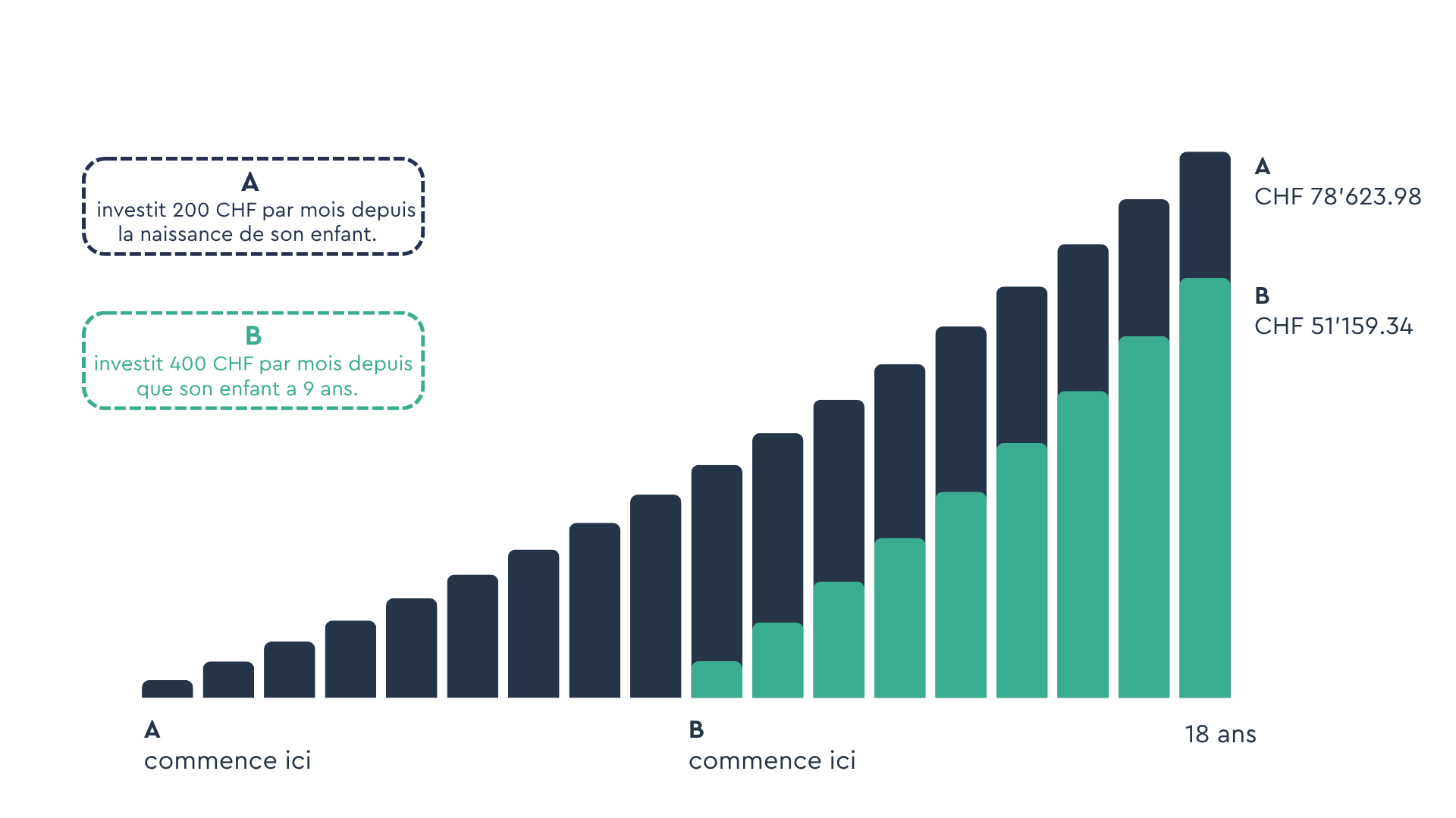 Le résultat : l’enfant de la personne A reçoit CHF 78’623.98 à son 18e anniversaire, contre seulement CHF 51’159.34 pour l’enfant de la personne B. Cela représente une différence de CHF 27’464.64, alors que le montant investi est identique pour les deux.