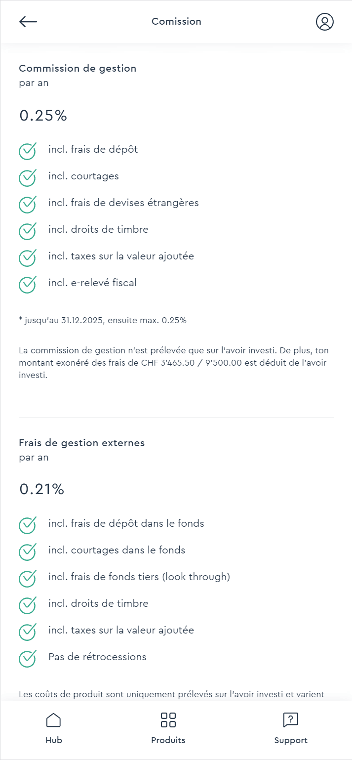 Avant d’investir, tu peux voir les frais exacts pour la stratégie que tu as choisie et comment elle est structurée. Bien entendu, tu peux aussi vérifier à tout moment le montant des frais que tu paies en cliquant sur ton portefeuille et en sélectionnant «Commission». C’est très simple. 😁
